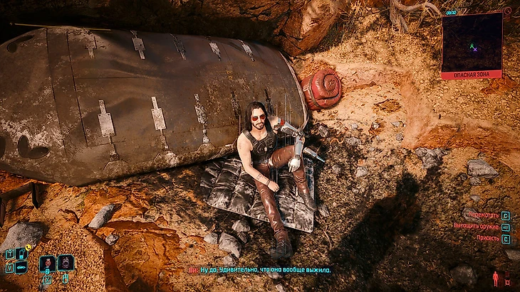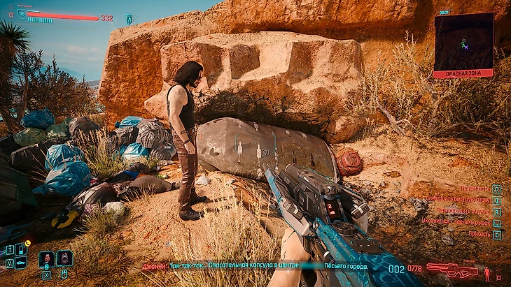 Капсулу уже пытаются обокрасть местные, но у них ничего не выйдет. Джонни заметит, что посадка Сойки была жесткой, а Ви удивится, что она вообще выжила в таких условиях. При наличии 20 техники можно открыть третий вариант для беседы – сказать, что она сменила траекторию, иначе мы бы любовались перемолотыми кусками мяса.