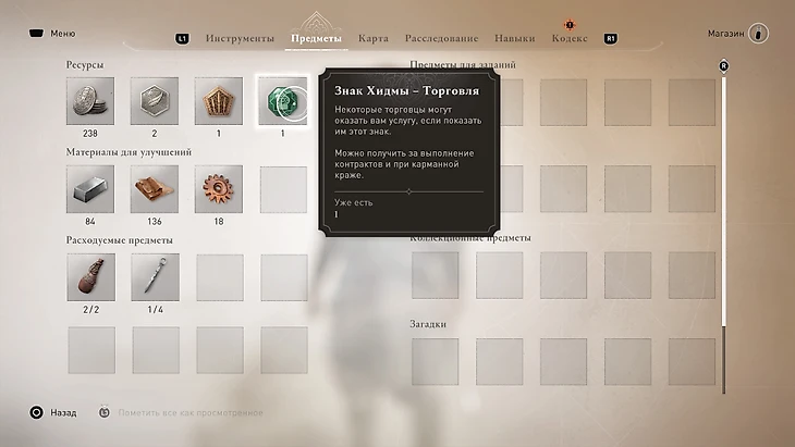 В чужих кошельках лежит много ценностей: деньги, безделушки на продажу, артефакты и, главное, знаки Хидмы. За предъявление знака можно получить услуги – к примеру, торговцы предложат хорошие цены, а глашатаи снизят вашу известность.