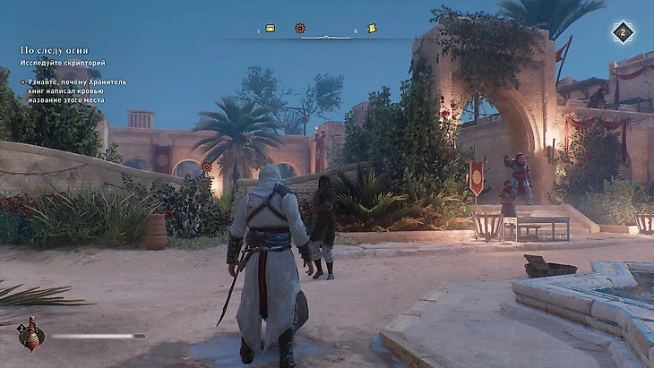Отправляйтесь по наводке в скрипторий. На его территории еще больше врагов. Можете действовать скрытно или же влезть в открытый бой, но в конце за дверью вас ждет испуганный переводчик. Он даст наводку на женщину-ученую по имени Захра, которая заперла его здесь и требует перевести таинственную книгу с неведомого языка.