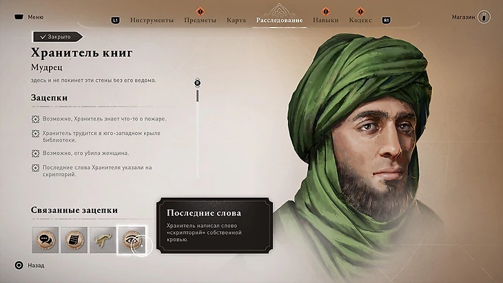 Маркер хранителя указывает на его местоположение на втором этаже. Пройдите к юго-западной части Дома мудрости, заберитесь на балкон и найдите открытое окно. Внутри большого помещения куча врагов, разберитесь с ними и обнаружьте мертвого хранителя. В его руке лежит оторванный клочок женского платья, а рядом лежит записка, где кровью написано слово «скрипторий».