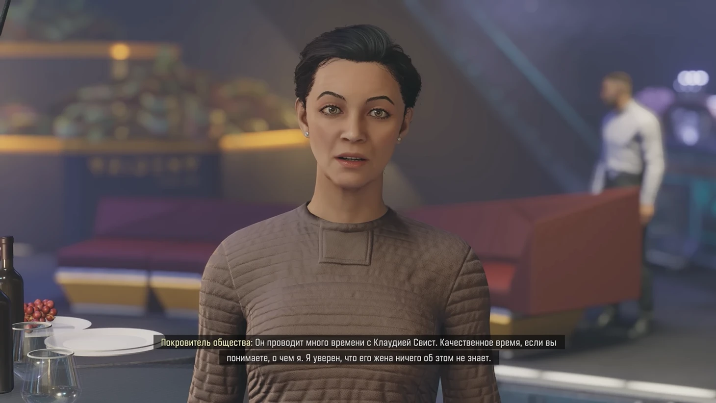 Вернувшись в главный зал, продолжите заводить беседы с NPC, помеченными как «покровители общества». Так, рано или поздно, вы услышите о романе Ларри Думброски с некой Клаудией Свист, который тот скрывает от своей супруги.