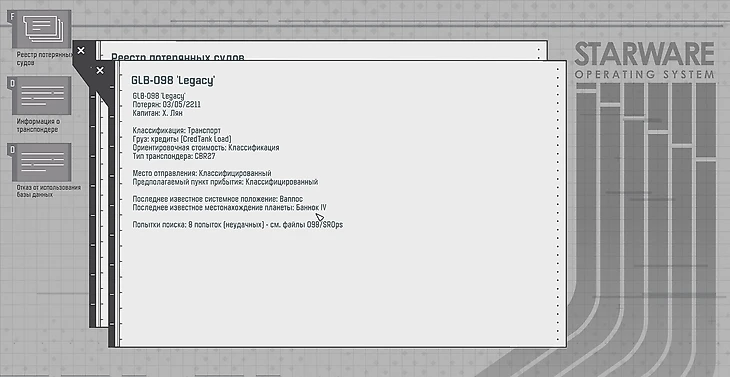 Завершив перестрелку, поднимитесь на второй этаж и воспользуйтесь настенным компьютером, чтобы найти данные о «Наследии». В файле будет сказано о восьми неудачных попытках найти судно и Банноке, как о его последнем известном местонахождении.