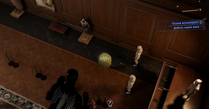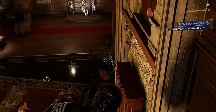 Затем направьтесь в другой конец зала и заберите усыпляющий дротик. Чтобы избавиться от лишних глаз, достаточно просто пустить паутину по вазе у стены, на шум от которой пройдет охотник у дивана.