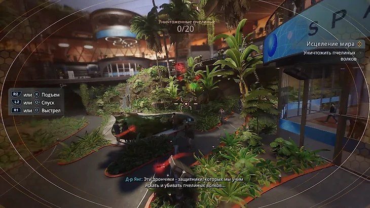 Начнется первая мини-игра. Доктор Янг расскажет о новом методе защиты пчел путем уничтожения их природного врага — пчелиного волка. Вам нужно будет опробовать эту технологию путем управления механизированным дрононом-пчелой. Чтобы завершить задание, облетите атриум здания и уничтожьте 20 хищников.