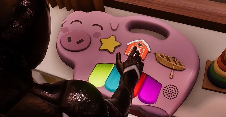 Над кроватью в детской будет музыкальная игрушка. Спуститесь на первый этаж и найдите документы о проводимых экспериментах и образцы крови. Воспользуйтесь музыкальным проигрывателем в форме свиньи в детской зоне. На нем вам нужно запустить мелодию, нажав на кнопку амбара.