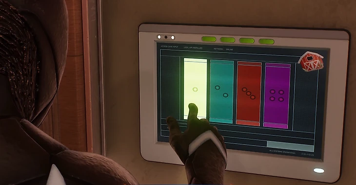 Нажмите на первые четыре клавиши ранее прослушанной мелодии: фиолетовый – фиолетовый – фиолетовый – зеленый. После успешного подбора слева откроется дверь в подвальную лабораторию.