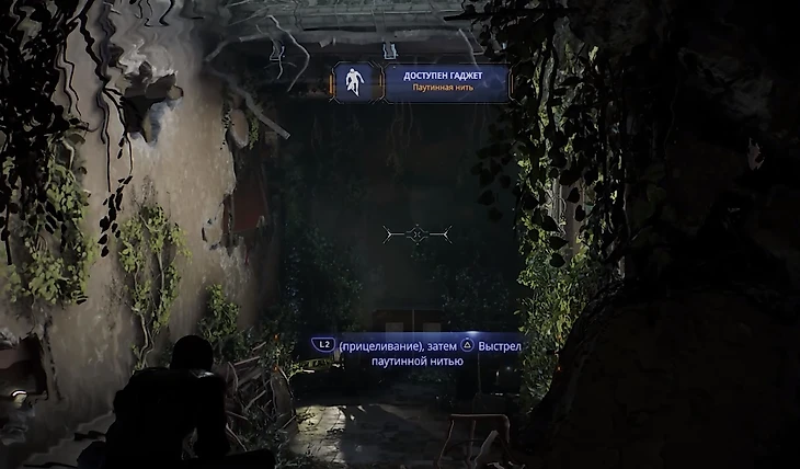 Он действует следующим образом: прицеливайтесь, нажав L2, а затем выпускайте паутину, нажав △. Так вы можете создавать нити паутины, по которым можно перемещаться. Сделайте такую нить и устраните противников бесшумной атакой сверху, а потом ползите в следующее помещение.