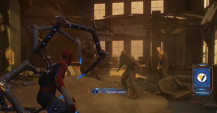 После того, как вас зашвырнут в здание неподалеку появится отличная возможность ознакомиться с иными комбинациями в погоне. Спасши работника офиса, вы столкнетесь с оппонентами. Опробуйте на них некоторые приемы, перед тем как разблокировать паучий шквал (L1 + квадрат).
