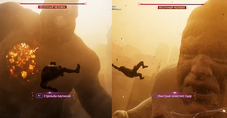 После этого используйте R1 для залпа паутиной, а затем притянитесь к его лицу для дополнительных атак. Проделайте это еще раз, чтобы лишить Песочного Человека руки, а позже и части головы.