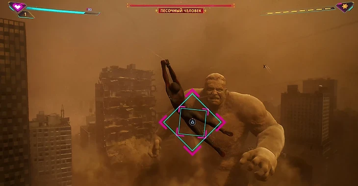 Проследуйте до нужной точки, параллельно знакомясь с механикой полета на паутине. После того, как вы уклонитесь от летящего объекта, перед вами появится и сам Песочный Человек. Используйте комбинацию L1+R1, чтобы метать во врага пролетающие предметы, после чего атакуйте его паутинным ударом, нажав треугольник в нужный момент.