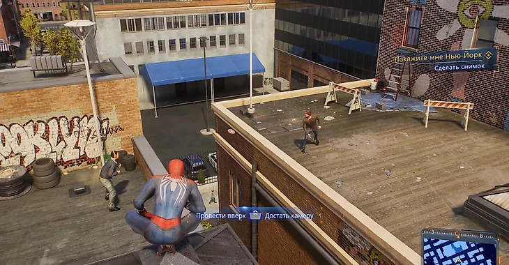 Используйте R3, чтобы включить сканирование и лучше увидеть необходимые места. Ознакомившись, следуйте на крышу одного из зданий, где горожанину нужна будет помощь. Вместе с Майлзом расправьтесь с группой бандитов. На этом миссия будет завершена, а вы сможете самостоятельно исследовать город!