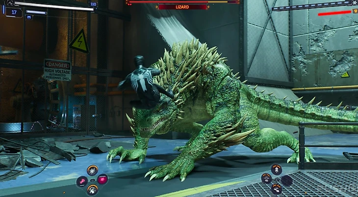 Объект отключится, Ящерица ударит Питера, вот и битва с боссом. Тут нужно обязательно уклоняться от атак противника и обращать внимание на сигнал тревоги вокруг головы Ящерицы. В этом бою вам нужно научиться парировать удары. Когда голова Ящера мигает красным, нажмите L1, чтобы парировать удар.