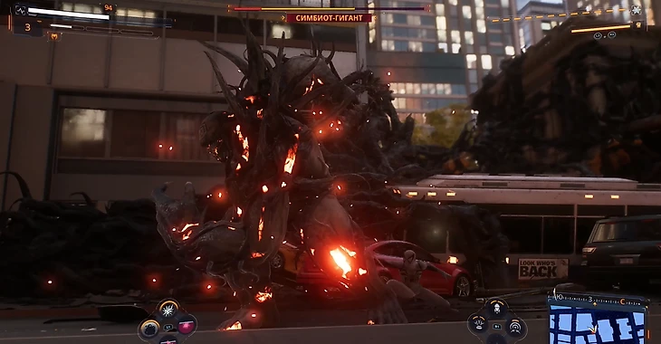 Симбиоты ловко уклоняются, потому вам придется наносить много атак своими особыми приемами. Также не забывайте о взаимодействии с ландшафтом – из некоторых машин вы можете выдернуть двери, чтобы ударить ими врагов, а в некоторых активировать сигнализацию, звук которой помешает сразу всем симбиотам.