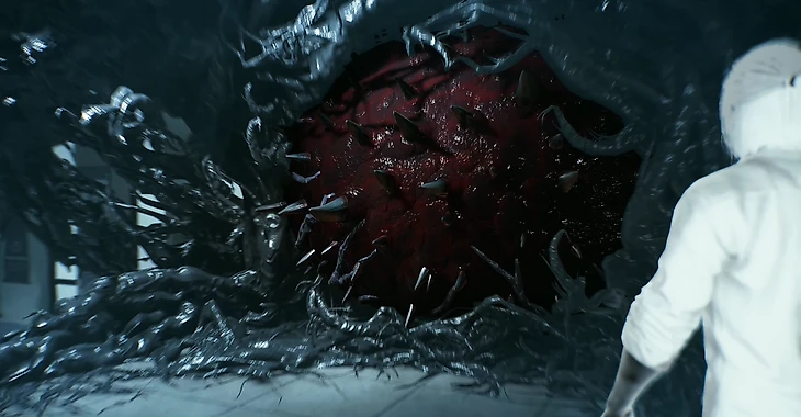 Вернувшись в ту комнату, зацепитесь за плоть симбиота, висящую на стене, и потяните на себя, пока не вырвите кусок стены. За ней вас будет ждать П.И.Р.