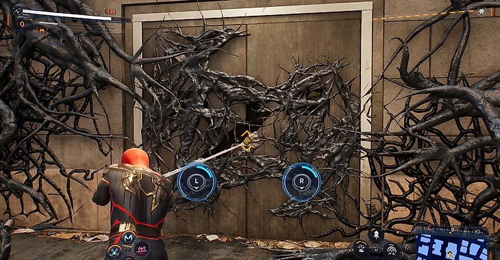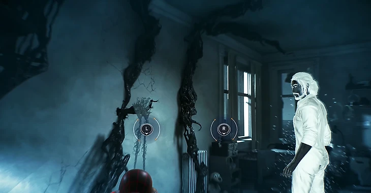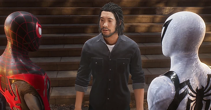 Однако как только вы освободите путь, из двери вас атакует новая группа симбиотов. В определенный момент оба Паука окажутся придавленными телами оппонентов, но на помощь придет Мартин Ли, который поможет Майлзу освободиться, создавая щит вокруг них. Он также скажет, что знает, как помочь Питеру, но для этого необходимо добраться к источнику.