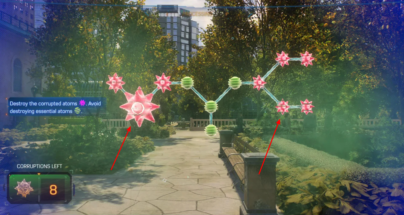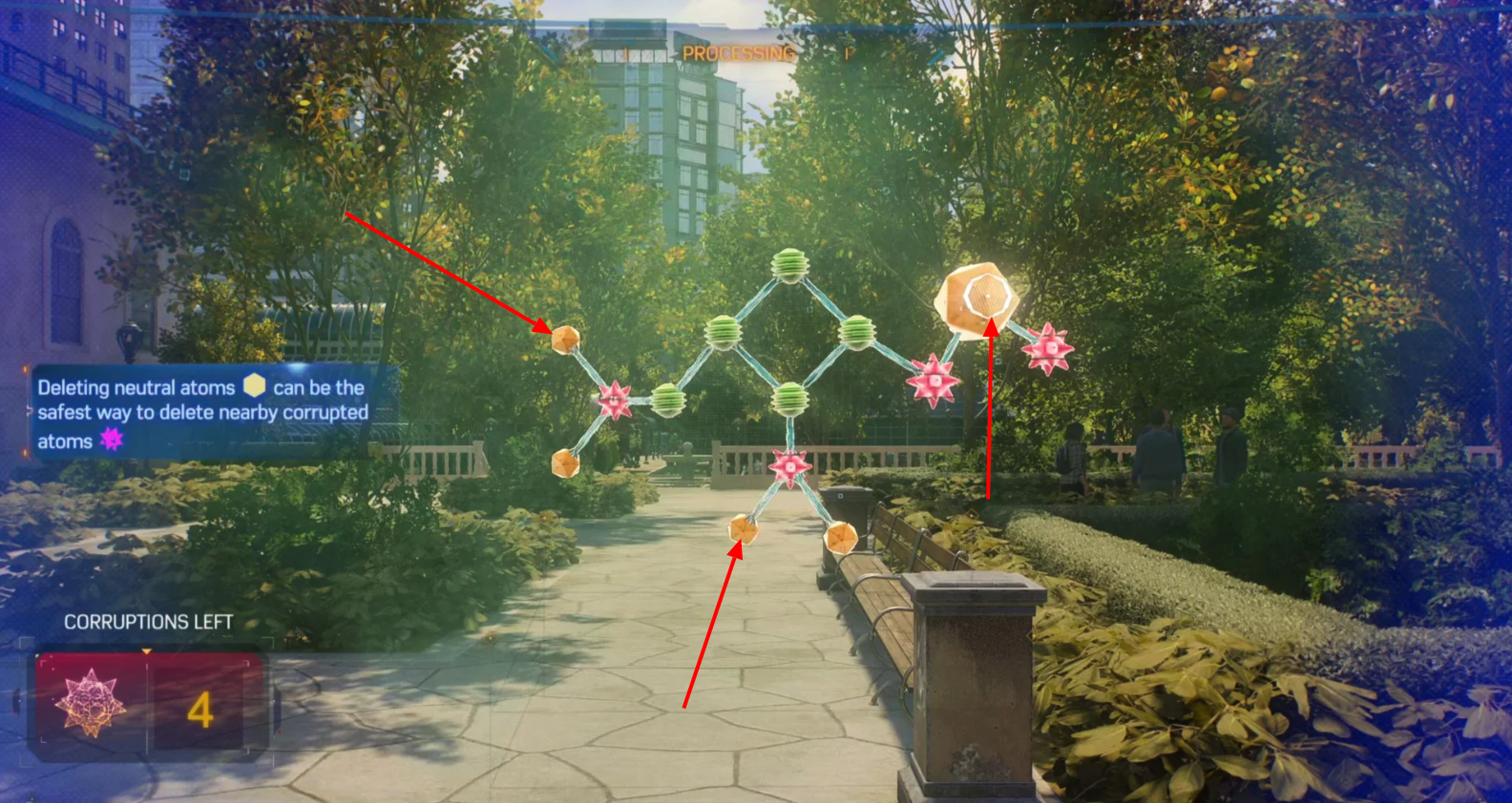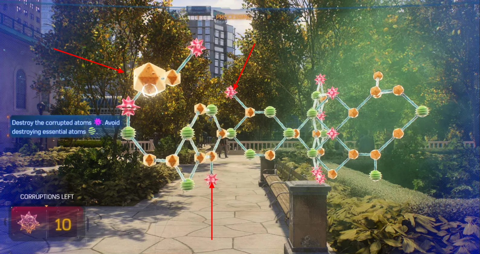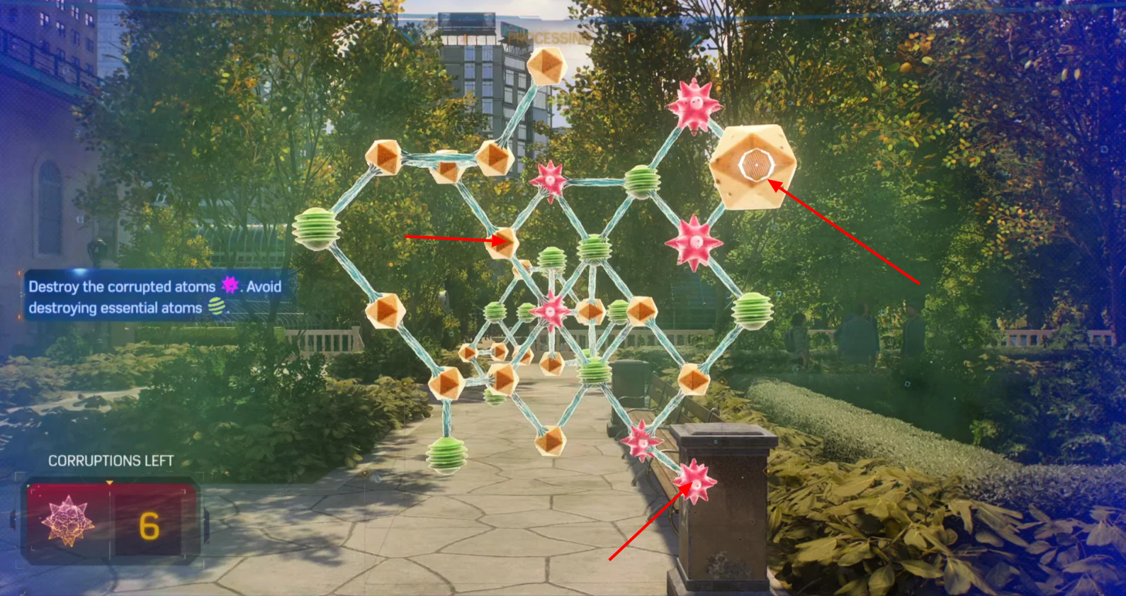 Нажмите кружочек, чтобы выйти из режима осмотра ингалятора. После этого сразу начнется мини-игра с химическим анализом содержимого. Вам предстоит уничтожить красные атомы в трех химических структурах, наводя курсор на них и нажимая крестик. При уничтожении атома также пропадут все атомы, соединенные напрямую с ним. Ваша цель уничтожить все красные, при этом сохранив все зеленые. Также можно уничтожать нейтральные оранжевые атомы.