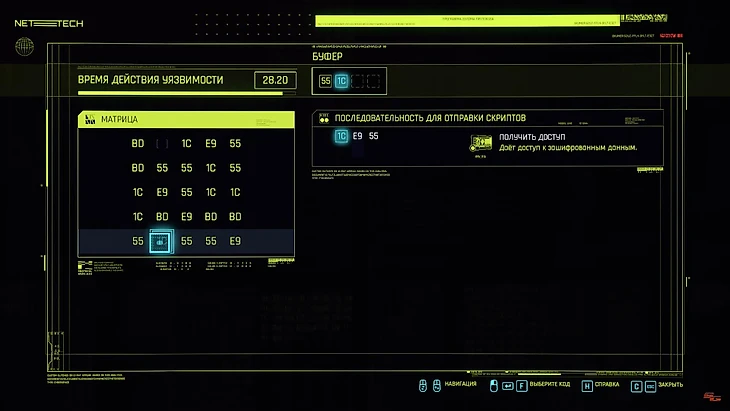 Взломайте чип. Для этого потребуется решить головоломку. Нужно переходить между строками и столбцами, поочередно задействовав числа из раздела «Последовательность для отправки скриптов». В случае неудачи снова отыщите чип в меню и начните взлом еще раз. При этом числа в строке «Последовательность для отправки скриптов» обновятся случайным образом.