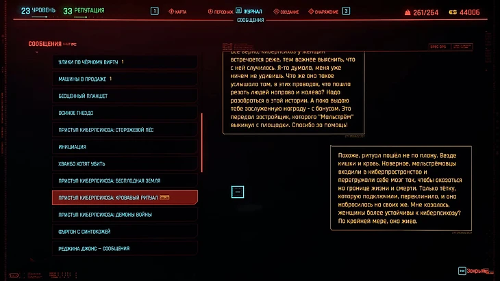 Отправить Реджине информацию о приступе киберпсихоза «Кровавый ритуал»