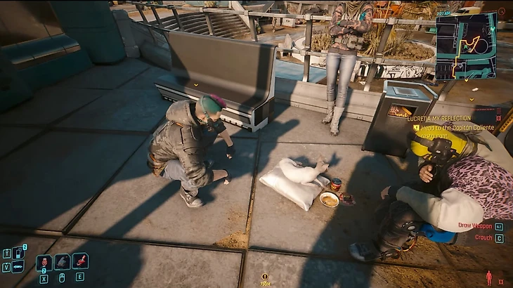 Задолго до начала Cyberpunk 2077 на Земле вымерли многие виды животных, в том числе и собаки. Обычные кошки тоже стали редкостью, поэтому каждая встреча с котиком – это радость. В Песьем городе (интересно, в честь кого назвали?) бандиты втроем собрались рядом с бездомной кошкой и принесли ей подушку. Бандит справа разминает стейк рукой, они собираются устроить бездомному животному роскошный обед. Ну разве не прелесть?