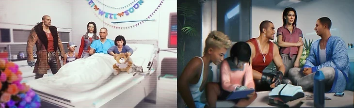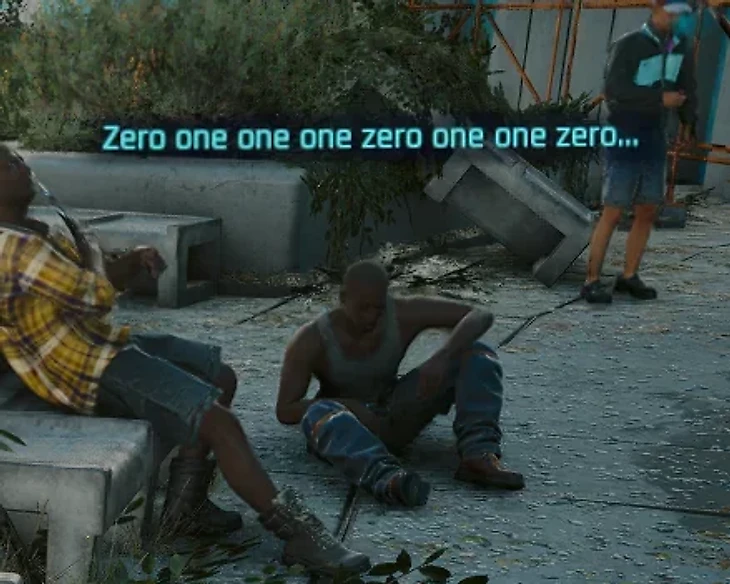 Два бездомных мужчины на улице ведут диалог: «Ты видел ангела с черными крыльями?» – «01110110» – «Да, именно этого». На них не так много хрома, как у Смэшера, чтобы можно было подумать, будто их мозг тоже заменили имплантами, поэтому сценка выглядит странно. Кстати, этот код расшифровывается как «V» – они обсуждают главного героя.