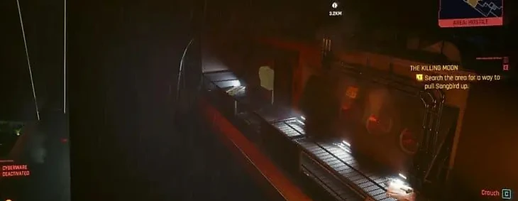 В новенькой униформе Corp-Bud вам надо помочь Сойке забраться на крышу. По маркеру задания, следуйте в коридор за охранником, далее на крышу космодрома.