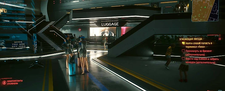 В космопорте передвигайтесь не привлекая внимания. Проходите пункт досмотра, где придется сдать оружие и отключить боевые импланты. После досмотра следуйте в зону с надписью «LUGGAGE». В одном из терминалов введите код 930604 и получите желтый чемодан. В нем будет униформа Corp-Bud, в которую вам надо переодеться (главное, чтобы вас не заметили).