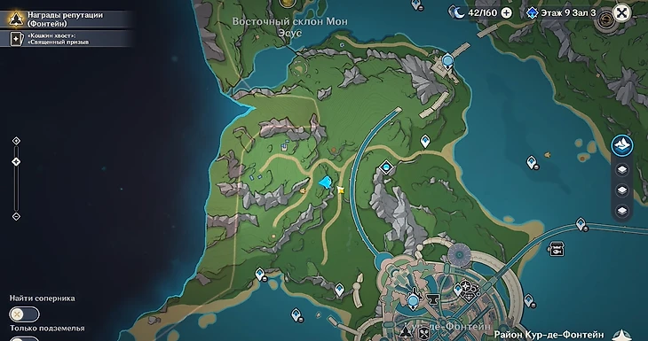 Убедитесь, что вы завершили цепочку квестов «Незавершенная комедия», задание «На цветочном лугу», сюжетную линию «По следам Нарцисса» и оба квеста «Погоня». После этого направляйтесь на указанный телепорт в Кур-де-Фонтейн.