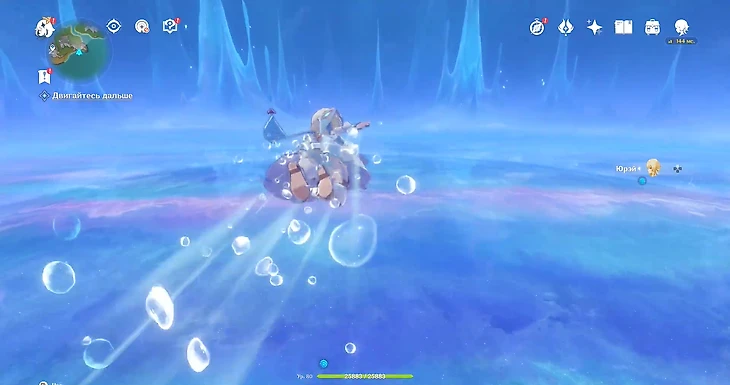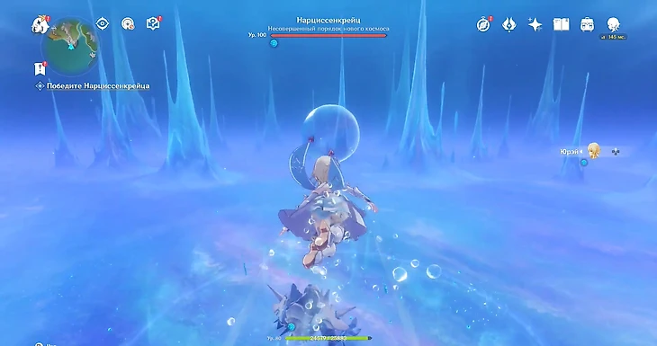 В конце пути доплывите к пузырю, висящему прямо над Нарциссенкрейцем и обрушьтесь на него с заряженной атакой. Это единственный урон, способный пробить босса.