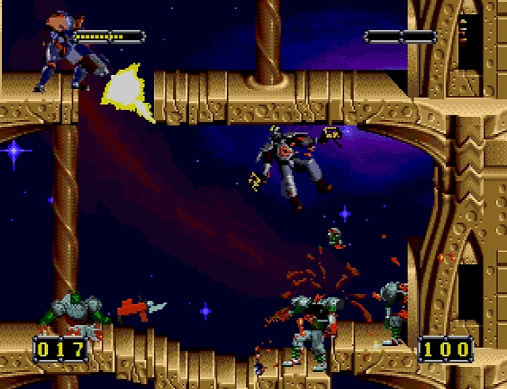 Геймплей: Перед вами зубодробительный боевик, в котором игрок управляет одним из героев - Хантером или Штайнером (или обоими, если играете вдвоём). На вооружении у каждого из них есть пулемет и доп оружие - огнемет у Штайнера и ракетница у Хантера. Другими отличиями персонажей являются типы ударов, которые они наносят сопернику (да, тут можно, так сказать, и в рукопашную пойти на врага) - у одного бойца это Пинок ногой, у другого - удар пулемётом. Этими ударами можно пользоваться, конечно же, только в ближнем бою и желательно, чтобы соперник был уже временно обезврежен. Тут, кстати, очень дурацкая система уничтожения врагов. Сперва вы должны в него попасть один-два раза, чтобы у него отлетела голова или ещё что. После этого враг несколько секунд стоит ничего не делая. Затем он достает оружие и начинает стрелять хаотично в разных направлениях. Поэтому, чтобы его убить полностью, нужно еще и добить это обезглавленное тело. В некоторых случаях это не обезглавленное тело, а наоборот - верхняя половина туловища с головой и руками. Но и она вам доставит кучу непритяностей! Другой момент - много врагов, которые чуть ли не каждым выстрелом будут попадать по вам, в каком бы месте вы не находились и их попадания выносят вам приличную часть здоровья. В общем, легкой прогулочки (как в Контре, например) тут не ждите.