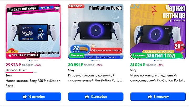 В интернет-магазине есть несколько предложений по продаже PlayStation Portal. Стоимость 30 000 – 31 000 рублей, в зависимости от продавца. Срок доставки – 12-16 декабря.