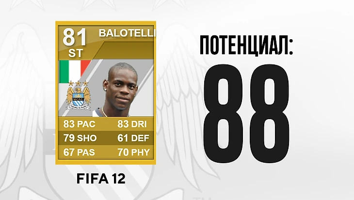 Поначалу карьера Балотелли в Англии складывалась удачно. Итальянец подменял основного нападающего «горожан» Карлоса Тевеса и сделал хет-трик в декабрьском матче против «Астон Виллы», а в следующем сезоне выдал отличный осенний отрезок и поучаствовал в разгроме «Манчестер Юнайтед» со счетом 6:1. Супер Марио выиграл чемпионство и довел сборную Италии до финала Евро-2012. Его рейтинг в FIFA 13 составил 84 балла.