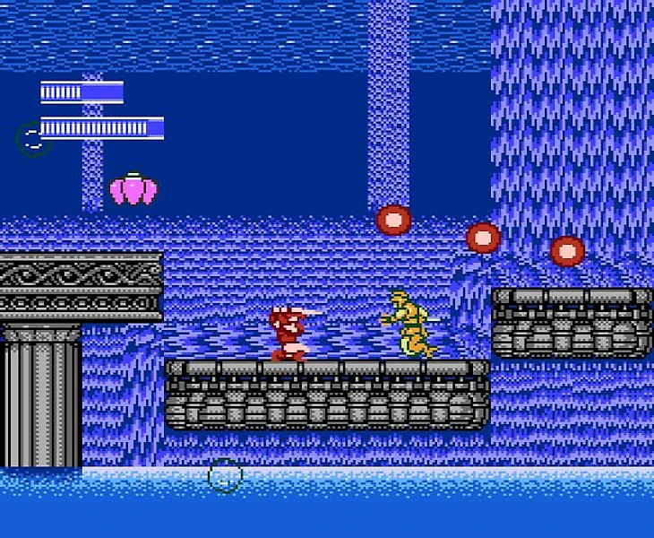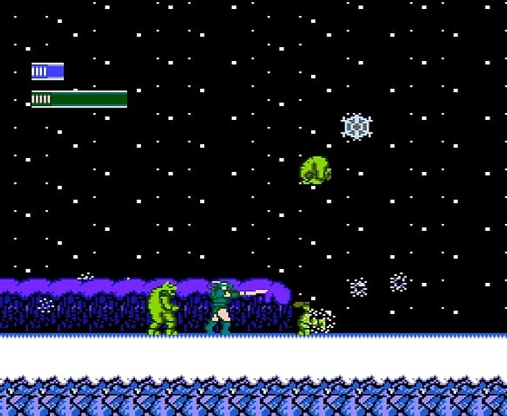 Графика хороша! Падающий снег на первом уровне (напоминает японскую версию Contra), огромные скелеты на заднем фоне, водопады – красота по меркам 8-битных игр. Музыка, фирменная для проектов Natsume, не только запоминается, но и задает темп прохождению. С первых же нот вспоминаются такие хиты, как Mitsume ga Tooru, Shatterhand и Kage. С последней, кстати, у Dragon Fighter много общего – и геймплей, и физика, и полоски здоровья.