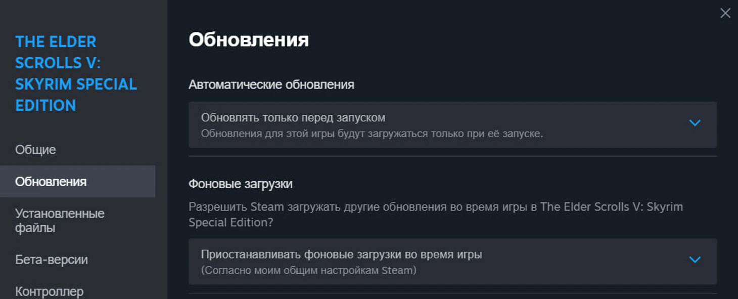 Зайдите в библиотеку Steam и найдите Skyrim. Кликните правой кнопкой мыши, выберите «Свойства», затем «Обновления». Там есть пункт «Обновлять только перед запуском» – он нам и нужен. Это сработает, если вы запускаете игру через SKSE, а не через библиотеку.