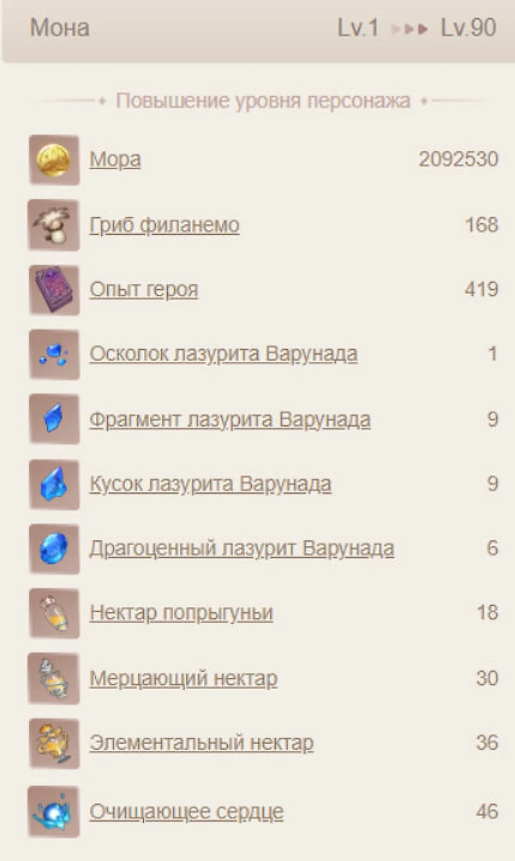 60: 3 куска лазурита Варунада, 8 очищающих сердец, 30 грибов филанемо, 18 мерцающих нектаров, 80 000 моры;