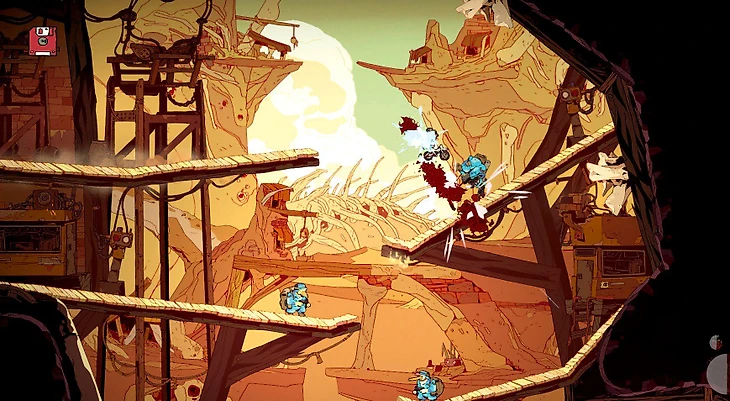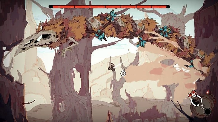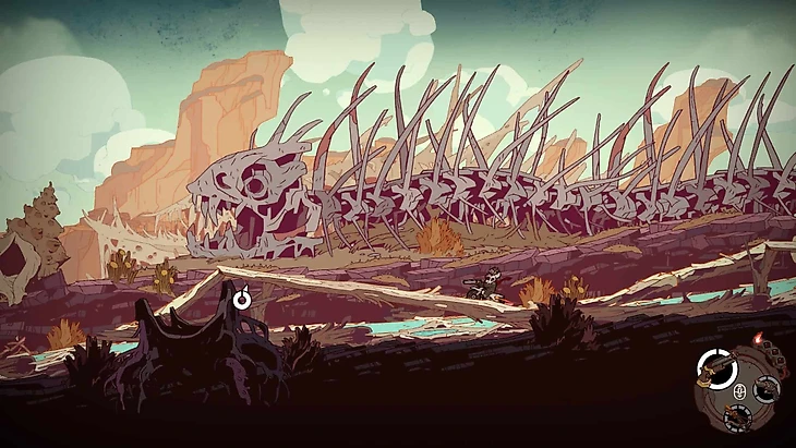 В игре есть точки возрождения – аналог костров в наших горячо любимых соулс-играх. Их достаточно много, и это удобно, ведь чуть зазеваешься и баланс потерян – тут даже от кочки на земле можно помереть. Погибать придется часто, повсюду опасность! Разновидностей врагов не так много, как хотелось бы, но со временем они становятся мощнее. Иногда стоит не нестись как угорелая, а поосторожничать, медленно проехать и посмотреть, что там дальше. Особенно красива стрельба в слоумо во время сальто – одно удовольствие плавно выполнять все трюки с первого раза и расправляться с пернатыми злодеями. И все это под очень приятные саундтреки: в игре вы сможете собрать целую коллекцию из песен и переключать их в плеере. Бодрая езда по «дороге ярости» под атмосферный сборник музыки, что может быть лучше? Я бы хотела сказать, что эта игра для чилла и расслабона, но все же сильно расслабляться не стоит. Местами тут бывает душновато и сложно, но это совсем не плохо.