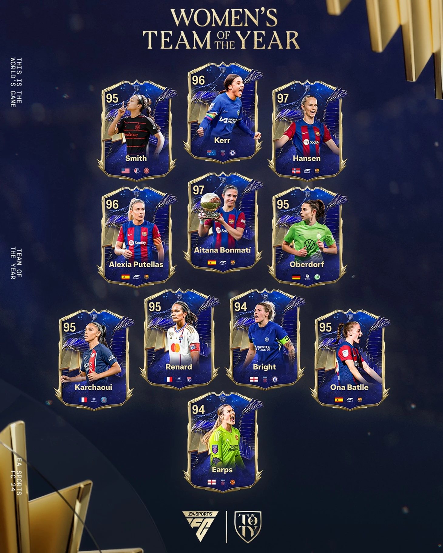 ● В топе женщин много знакомых имен. TOTY-карточки получили последние обладательницы «Золотого мяча» Айтана Бонмати и Алексия Путельяс, фланговая нападающая «Барселоны» Каролина Хансен и Сэм Керр с обложки прошлой части – FIFA 23.