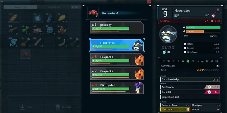 Палов, которых вы взяли с собой в пати, можно кормить прямо из инвентаря. Для этого откройте инвентарь, выберите еду и нажмите на нее правой кнопкой мыши. Появится меню, где нужно выбрать того пала, которого вы собираетесь кормить. Но так нельзя покормить тех палов, которые остались на базе.