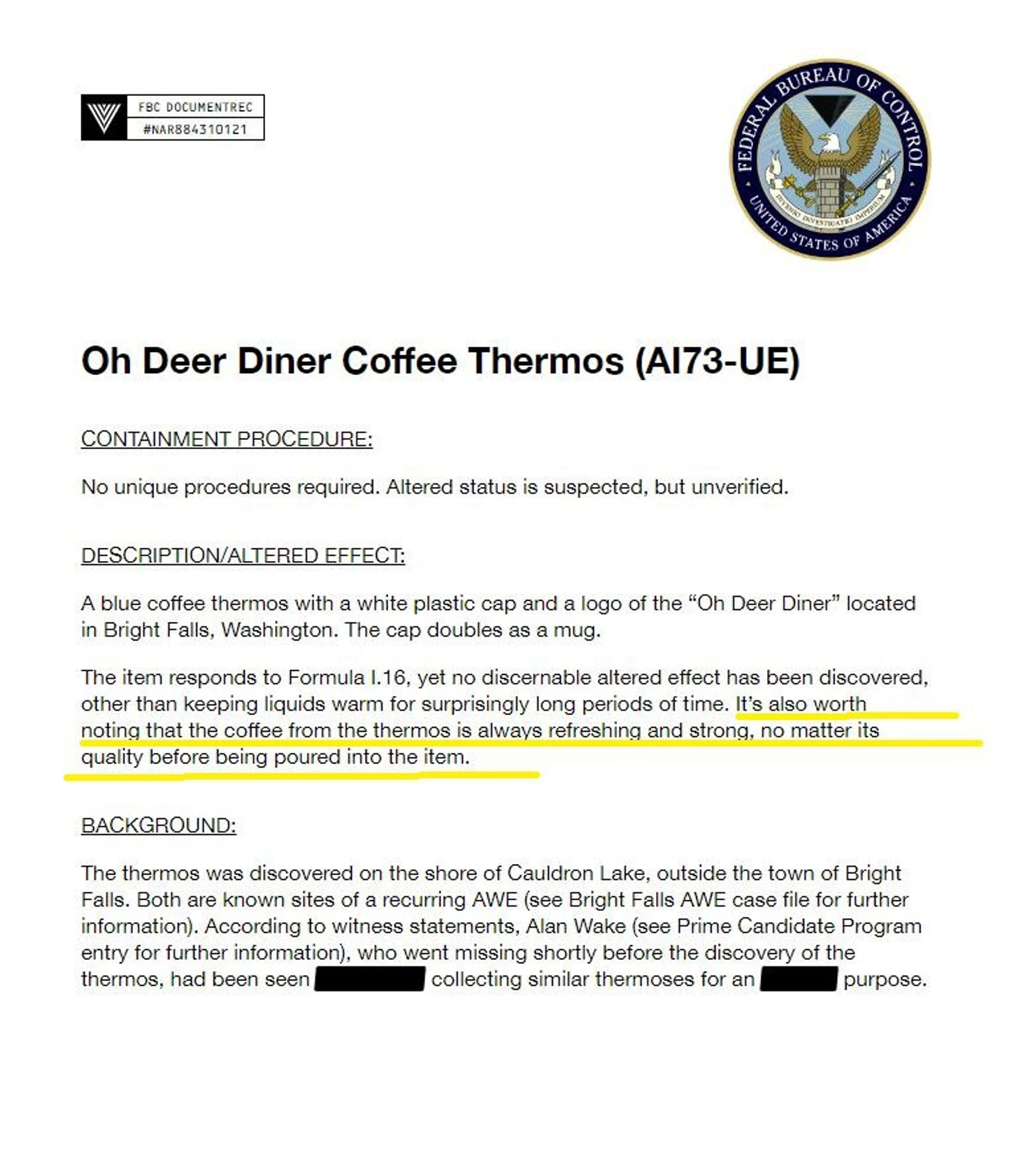 Вернемся к нашему кофейному расследованию (у нас же игра про расследование). Первую улику мы найдем в оригинальной Alan Wake: там термосы с кофе относятся к коллекционным предметам. Если найти 25 штук, получишь достижение «Чашка отличного кофе». В Control, другой игре Remedy, есть отчет AI73-UE о термосах, которые искал Алан Уэйк. Там говорится об их сверхъестественных свойствах: «…кофе из термоса всегда освежающий и крепкий независимо от его качества перед заливкой в изделие».