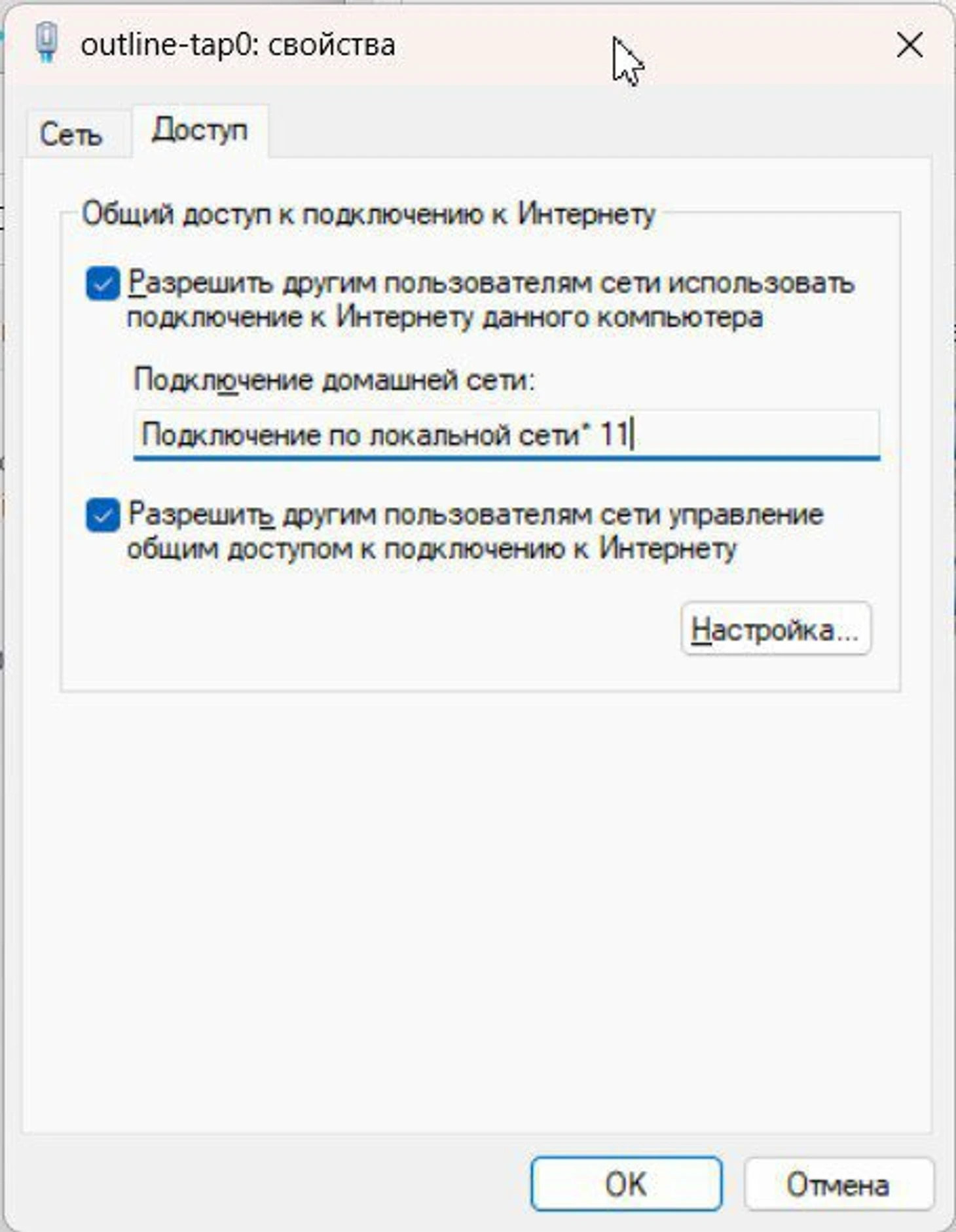 вернитесь в «Сетевые устройства», найдите подключение с названием VPN, во кладке «Разрешить другим пользователям Сети использовать подключение к Интернету» выберите локальную сеть, появившуюся при раздаче интернета на консоль. Нажмите «ОК».
