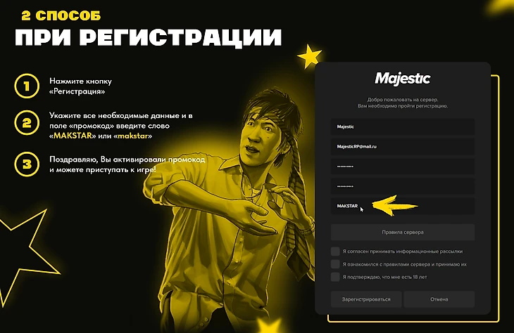 Важно отметить, что промокод MAKSTAR, а также любые другие промокоды Маджестика дают АБСОЛЮТНО ОДИНАКОВОЕ КОЛИЧЕСТВО БОНУСОВ, а именно 50.000$ и Platinum Vip статус персонажа на 2 недели (14 дней). Все сайты, на которых указаны другие условия бонусов с промокода, отличающиеся от вышеописанных, являются не более чем пиар-ходом этих самых партнеров, чтобы получить преимущество перед своими коллегами.