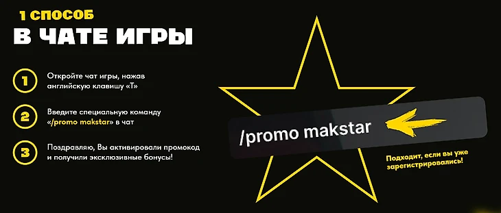 MAKSTAR - для активации ввести в чат игры /promo MAKSTAR