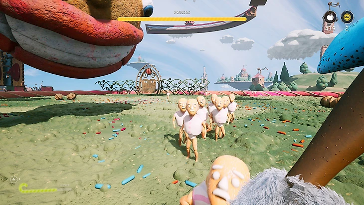 Сложность в том, что Колобок призывает мобов. Больших красных Вовчиков нужно устранять, а маленькие станут вашим оружием. Возьмите в руки стартовую дубину и нажмите правую кнопку мыши. Особый удар подкинет мелких неприятелей вперед. Задача – попасть Вовчиками в Колобка.