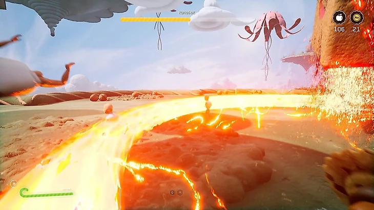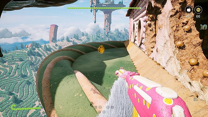 Добравшись до чекпоинта, вы попадете на пряничную арену. Снова просто стреляйте по бочкам, когда рядом с ними появятся враги. Опасайтесь исчезающих платформ под персонажем. Они будут мерцать перед тем, как исчезнуть, старайтесь как можно быстрее перемещаться на другие платформы. По завершении сражения вы получите монету.