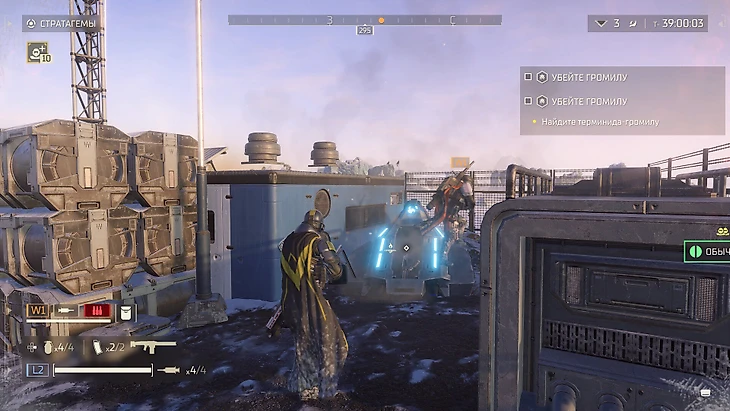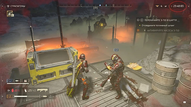 Время выполнения каждой миссии ограничено. Если не уложитесь в лимит, все еще сможете эвакуироваться. Проблема в том, что стратагемы отключатся, так что запросить патроны и орбитальный удар не выйдет. Если грамотно выстроите оборону и будете носиться по месту посадки, возможно, уцелеете.