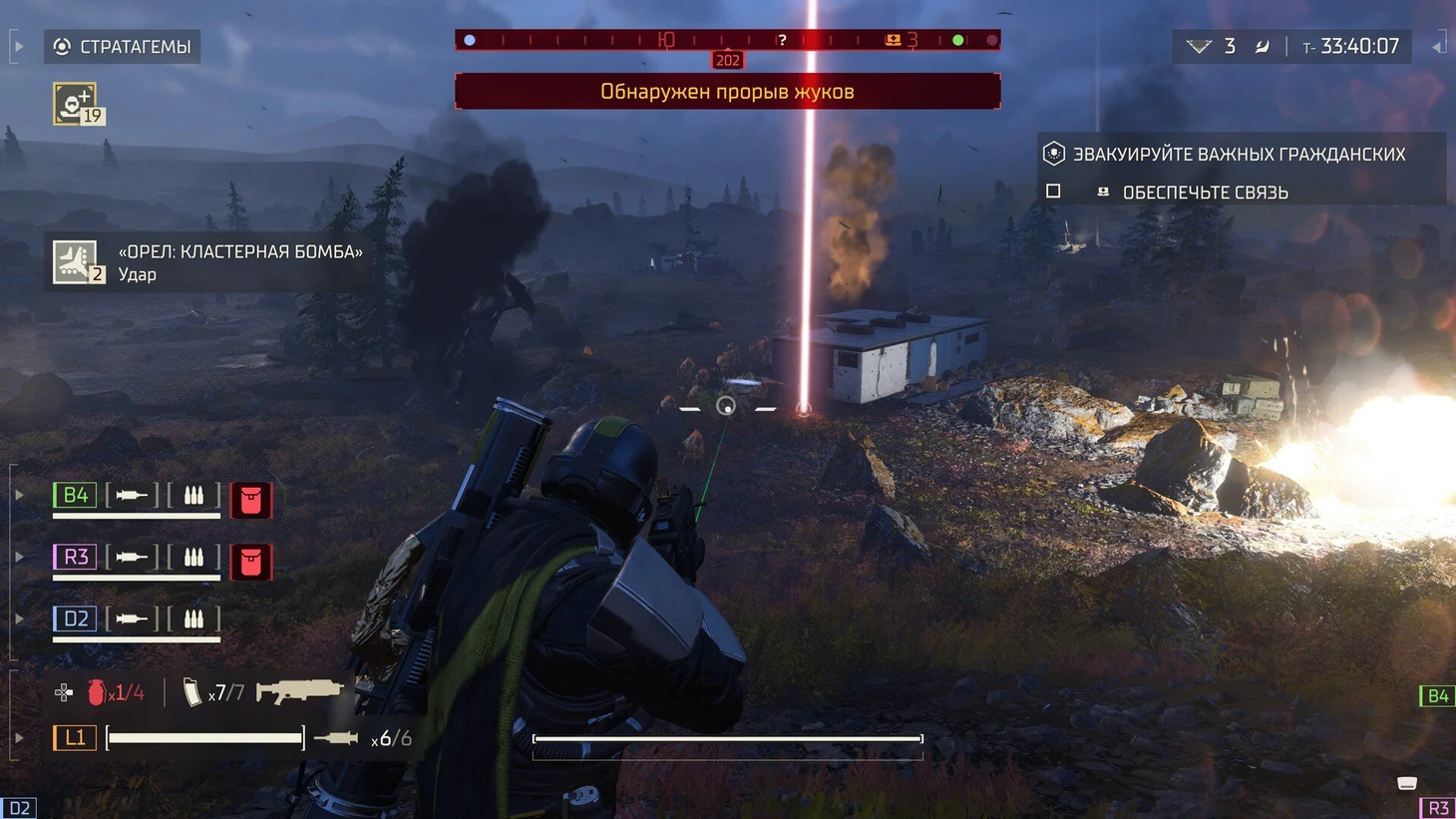 В игре есть оборонительные и атакующие стратагемы – вам понадобятся оба типа. Агрессивно зачищаете гнезда жуков? Примениту кассетный удар: он выкосит врагов и уничтожит пару гнезд. Пора бежать? Используйте напалм, и многие враги не прорвутся сквозь огненную стену. Уже эвакуируетесь? Без турели или миномета не обойтись.