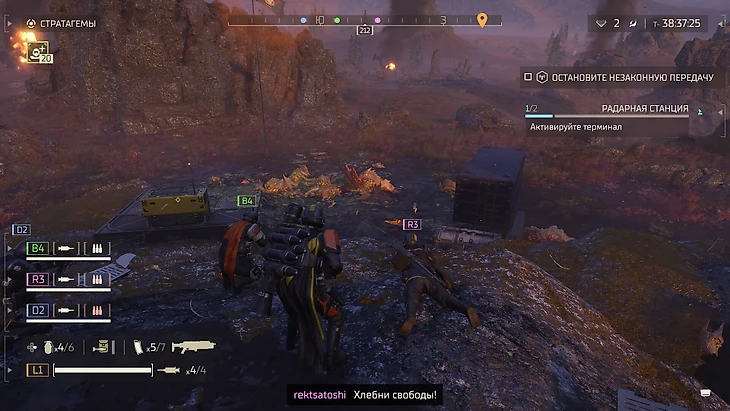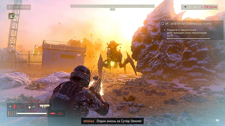 Не зацикливайтесь на оружии и стратагемах, которые кажутся рабочими. К примеру, стартовый пулемет бесполезен на уровнях с бронированными врагами – зато рельсотрон пробьет даже толстый кусок металла. Орбитальный удар тоже стоит заменить, допустим, на кассетную бомбардировку. Главное, экспериментируйте с билдом на низкой сложности, иначе подведете напарников.