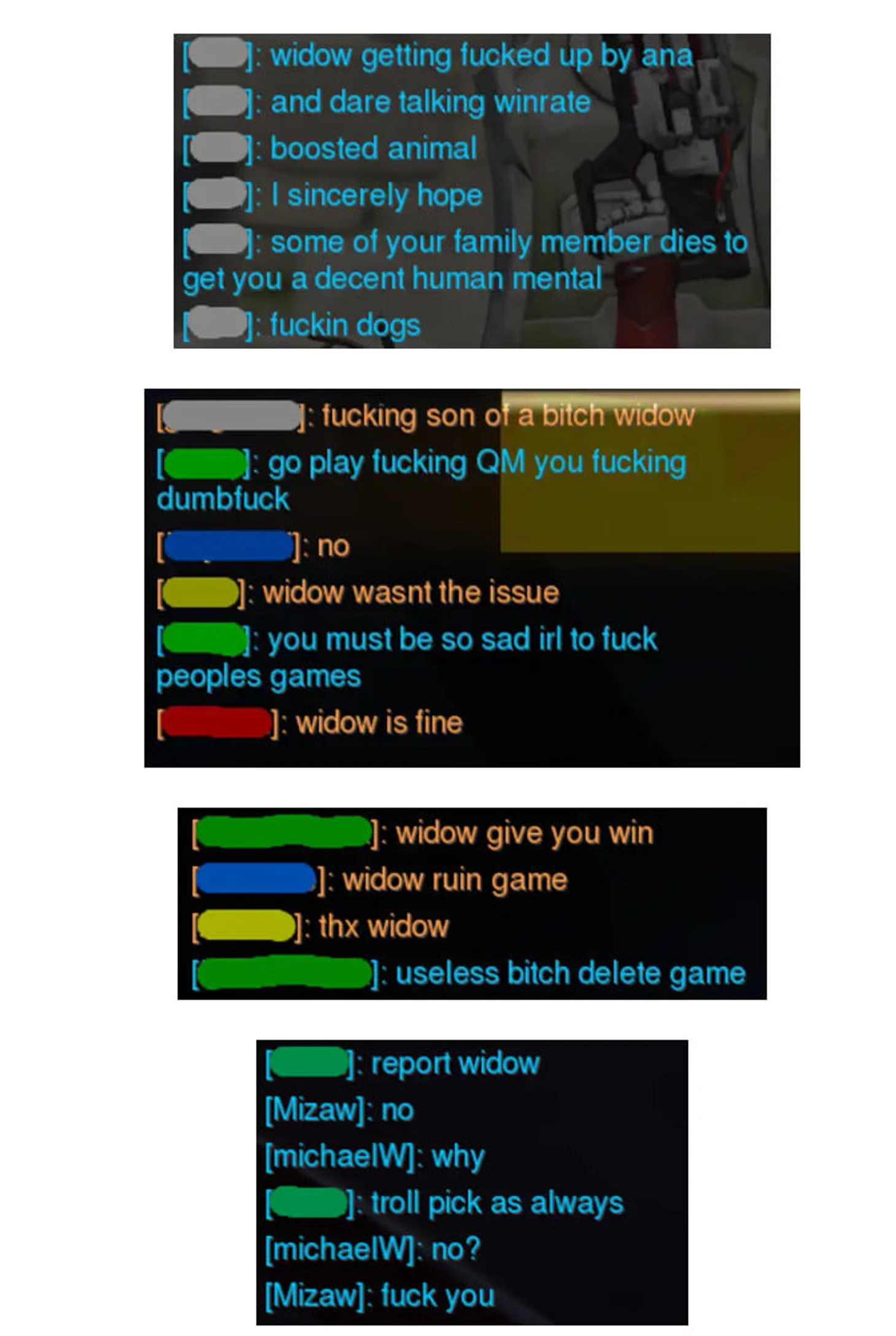 «Я искренне надеюсь, что кто-нибудь из твоей семьи умрет», «Сукин сын на Вдове», «130 часов на Вдове, и ты так ##### играешь, мусор».