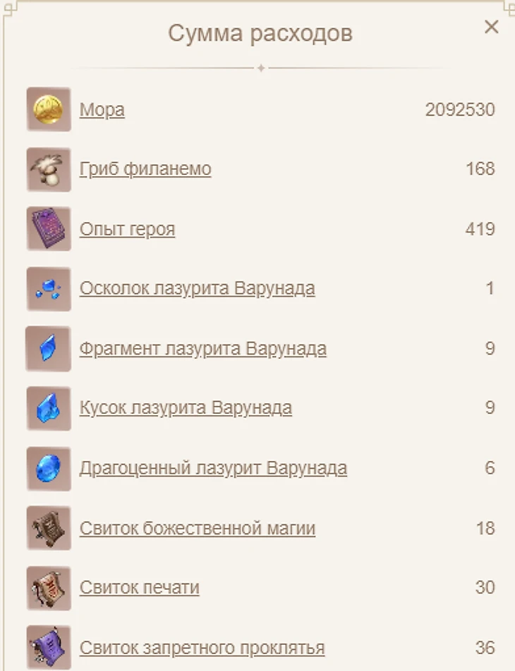 Осколок, фрагмент, кусок и драгоценный лазурит Варунада – можно получить за победу над океанидом, Гидро гипостазисом, гидротульпой, суаньни-отшельником, драконом вечных бедствий, Ужасом Бури, Секи но Ками, Чайльдом и всепожирающим нарвалом, а также с боссов, перенимающих стихию Гидро: древнего геовишапа, Аждахи и чудовищного крестителя.