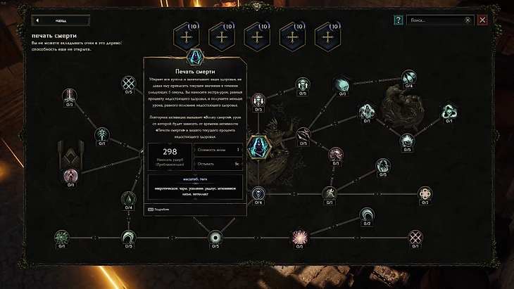 «Призыв эфемерного зомби» и дополнительные навыки «Ненасытный», «Притяжение могилы», «Пробуждающее присутствие». Еще один миньон для генерации урона;