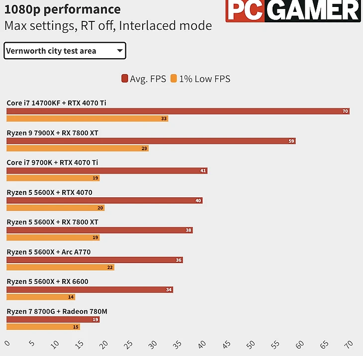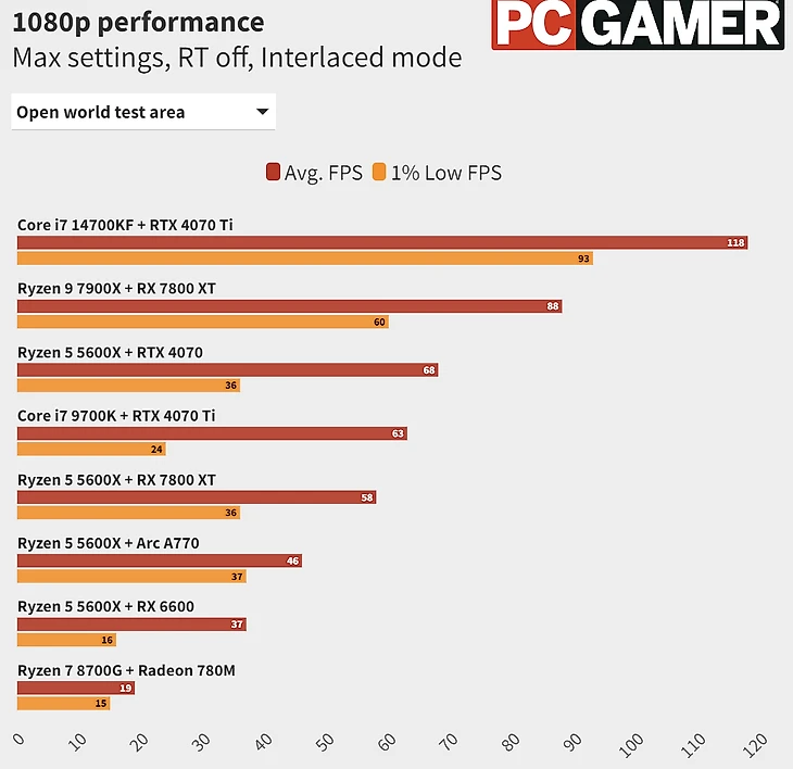 В Digital Foundry выяснили, что производительность игры больше зависит от процессора, чем от видеокарты. Специалисты замерили кадровую частоту в городе и открытом мире на разных сборках. При разрешении 1080p на максимальных настройках графики получается 60–70 fps в городе даже на довольно дорогих сборках, а на системах попроще – около 40 кадров.